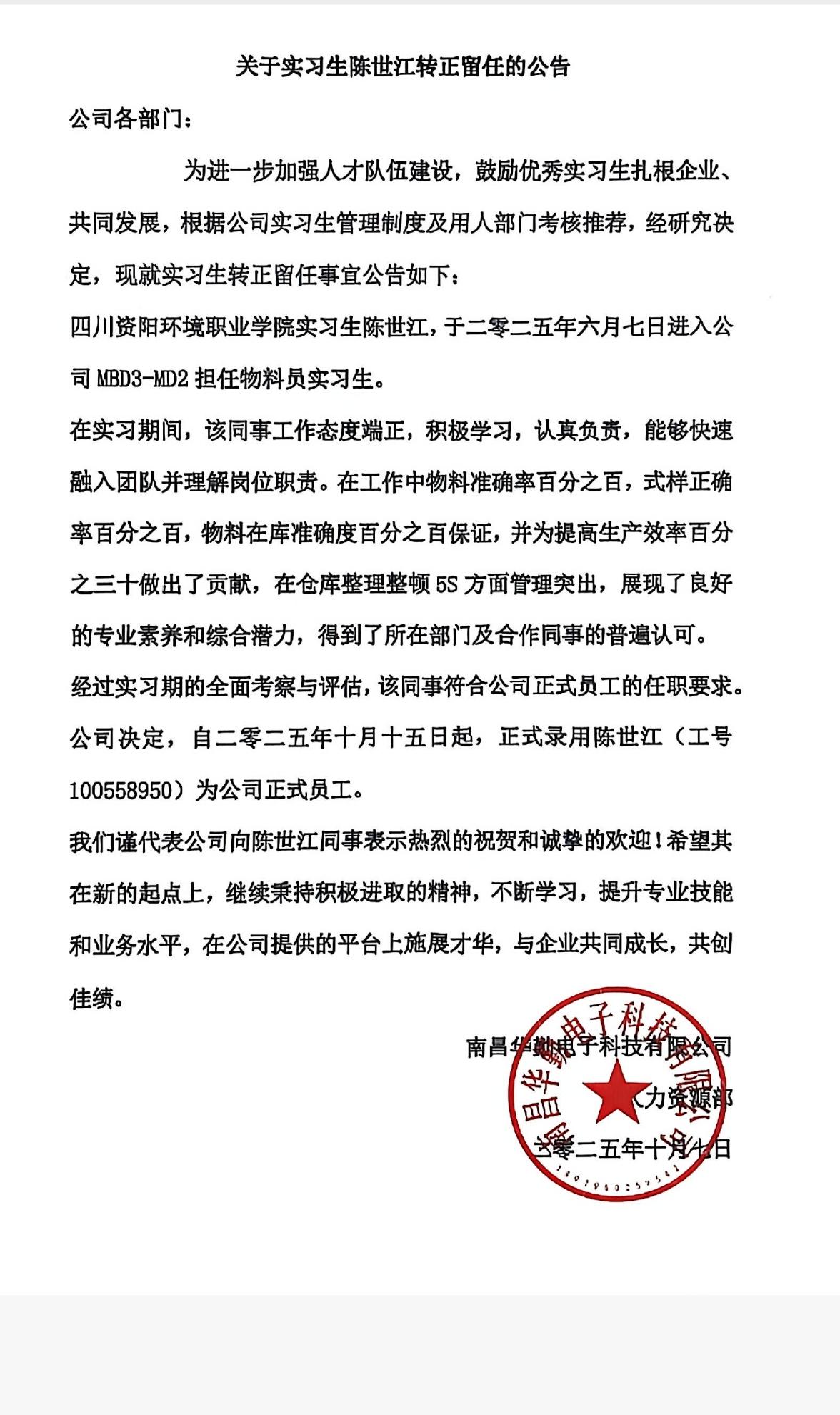 实践过程中,陈世江展现出极强的责任心与执行力。在工作中,他凭借细致严谨的工作作风,做到了物料准确率100%,式样正确率100%,物料在库准确率100%,并为提高生产效率30%做出了突出贡献。其主动学习的态度、高效的问题解决能力以及良好的团队协作精神,不仅赢得了部门同事的广泛认可,更获得企业人力资源部门与管理层的高度评价。经过综合考核,企业决定打破常规实践周期,提前为其办理录用转正手续。