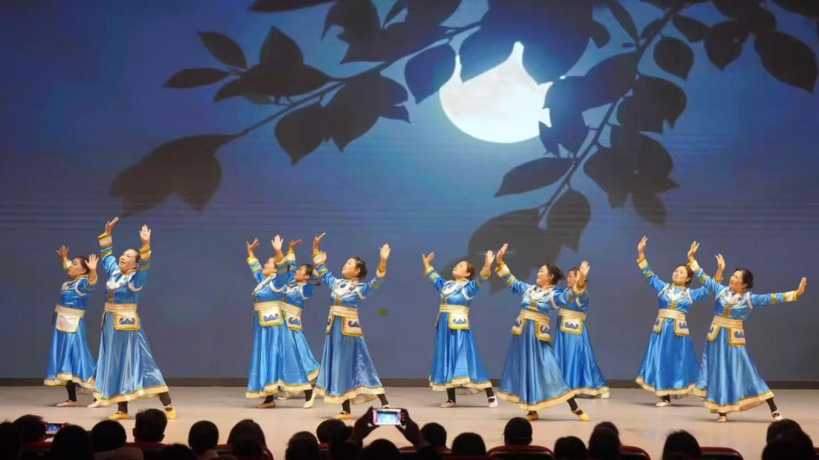 舞台背景的 “明月” 缓缓亮起,身着湖蓝色蒙古长裙的中老年学员们轻抬手臂,舒展的姿态里藏着岁月沉淀的优雅。这支舞蹈由资阳环境科技职业学院老年大学民族舞班的潘雅璐老师为学员量身编排,动作既保留了民族舞的柔美韵律,又适配中老年人的身体节奏 —— 舒展的群舞队形如月光轻洒,错落的转身、轻摆的裙摆,将 “月下悠然” 的意境演绎得细腻动人。“我们平均年龄快 60 岁啦,一开始担心学不会舞蹈动作,都是老师耐心拆分每个步骤,陪着我们练习。” 参演的李阿姨笑着说,“现在跳起来不仅身体舒展,心里也跟着亮堂,这就是学习的快乐!”