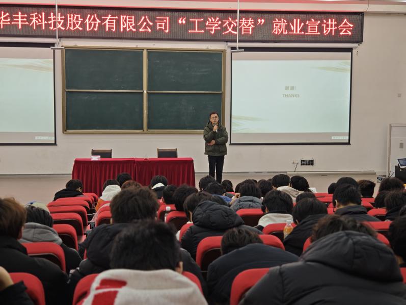 2025年12月16日,四川华丰科技股份有限公司(以下简称“华丰科技”)受邀走进生态环境学院,面向24级环境工程1-5班220名学生开展专场宣讲会。活动在C103教室举行,华丰科技人事经理杜谨辰、生态环境学院副院长黄相玲共同参与,围绕企业需求、人才培养及产学研合作展开深度交流。