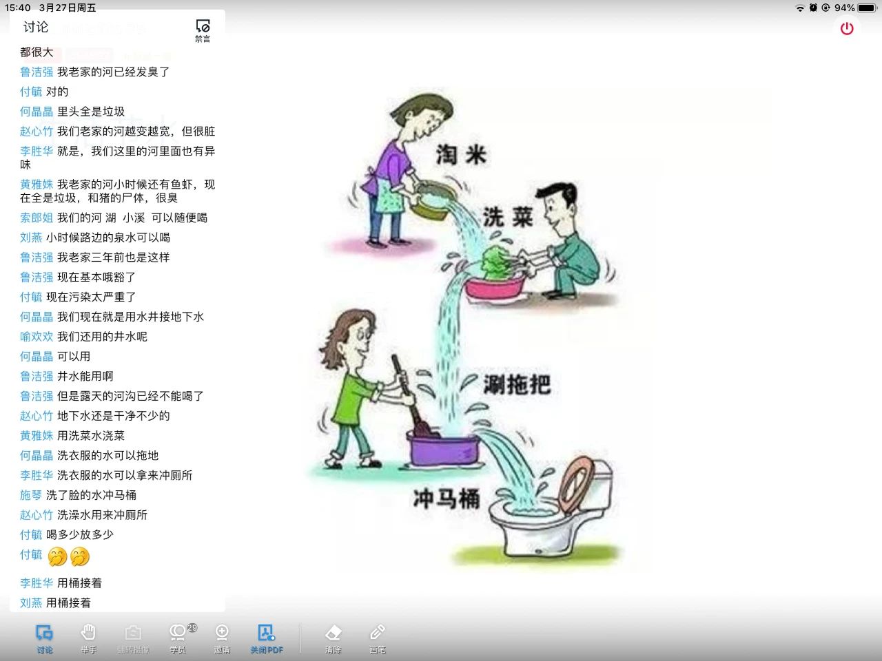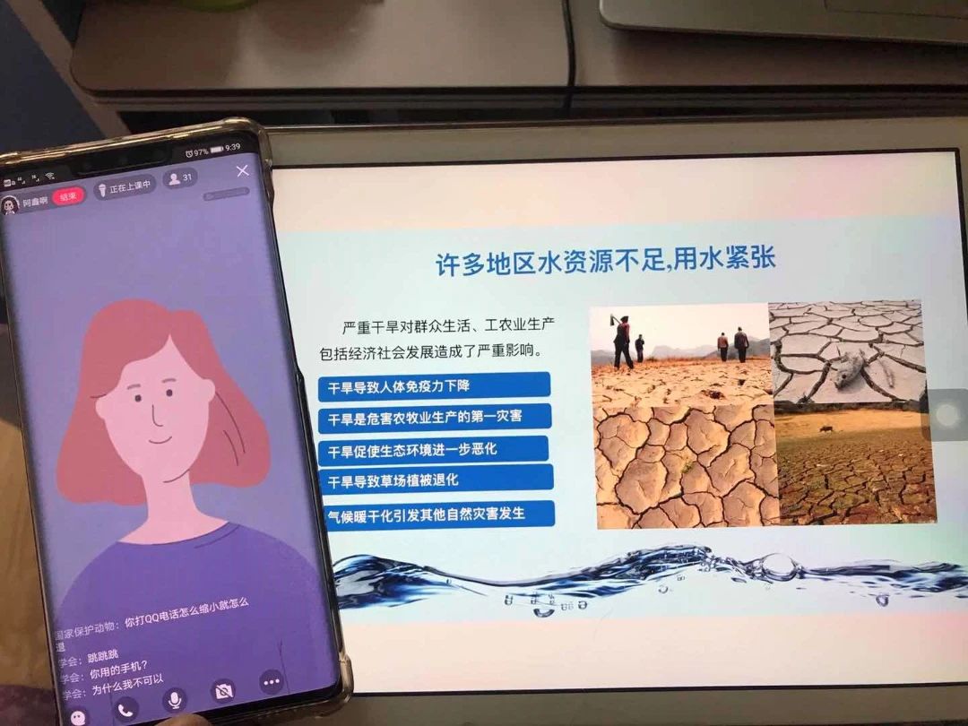 3月27日,老师们使用不同的平台进行直播讲授这堂意义非凡的网络课,同学们也是兴趣十足,积极主动回答问题,甚至举一反三,提出各种节约水资源的方法。