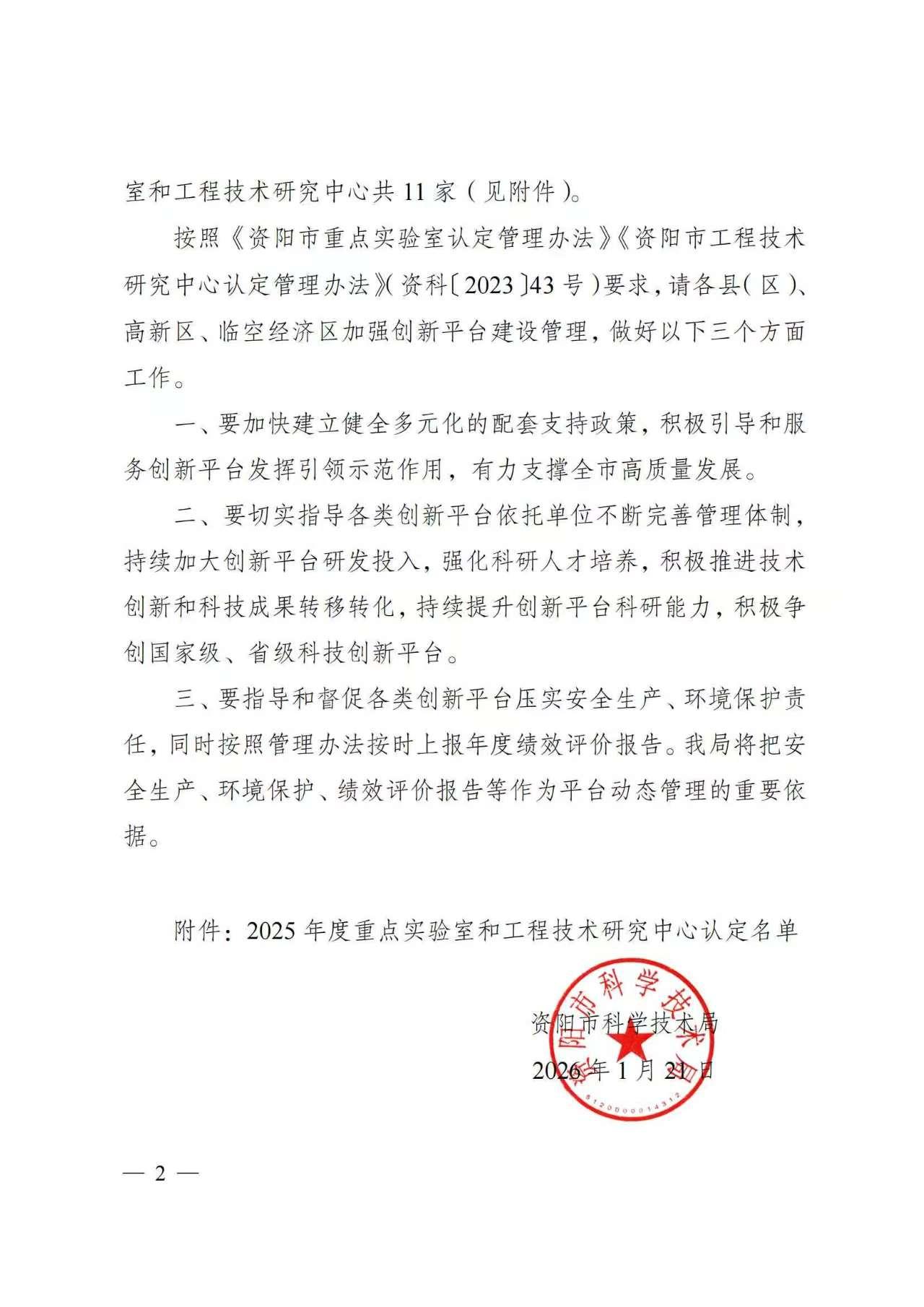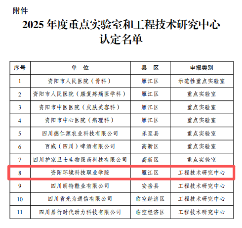 2026 年 1 月 21 日,资阳市科学技术局正式印发《关于认定 2025 年度重点实验室和工程技术研究中心的通知》(资料〔2026〕5 号),由我校生态环境学院牵头、联合四川新环科技有限公司共建的资阳市环境保护工程技术研究中心成功通过市级认定。这是我校继 “资阳市生态环保工程研究中心” 后,在环保科研领域新增的高水平实体化平台,恰逢国家 “十五五” 规划谋划与推进的关键阶段,将为资阳践行绿色发展理念、融入国家中长期生态保护战略注入强劲科研动能!